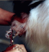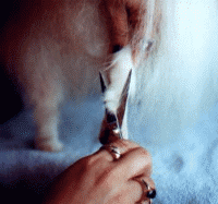 trimming and cleaning up the look of the hock on the rear leg. The hock
